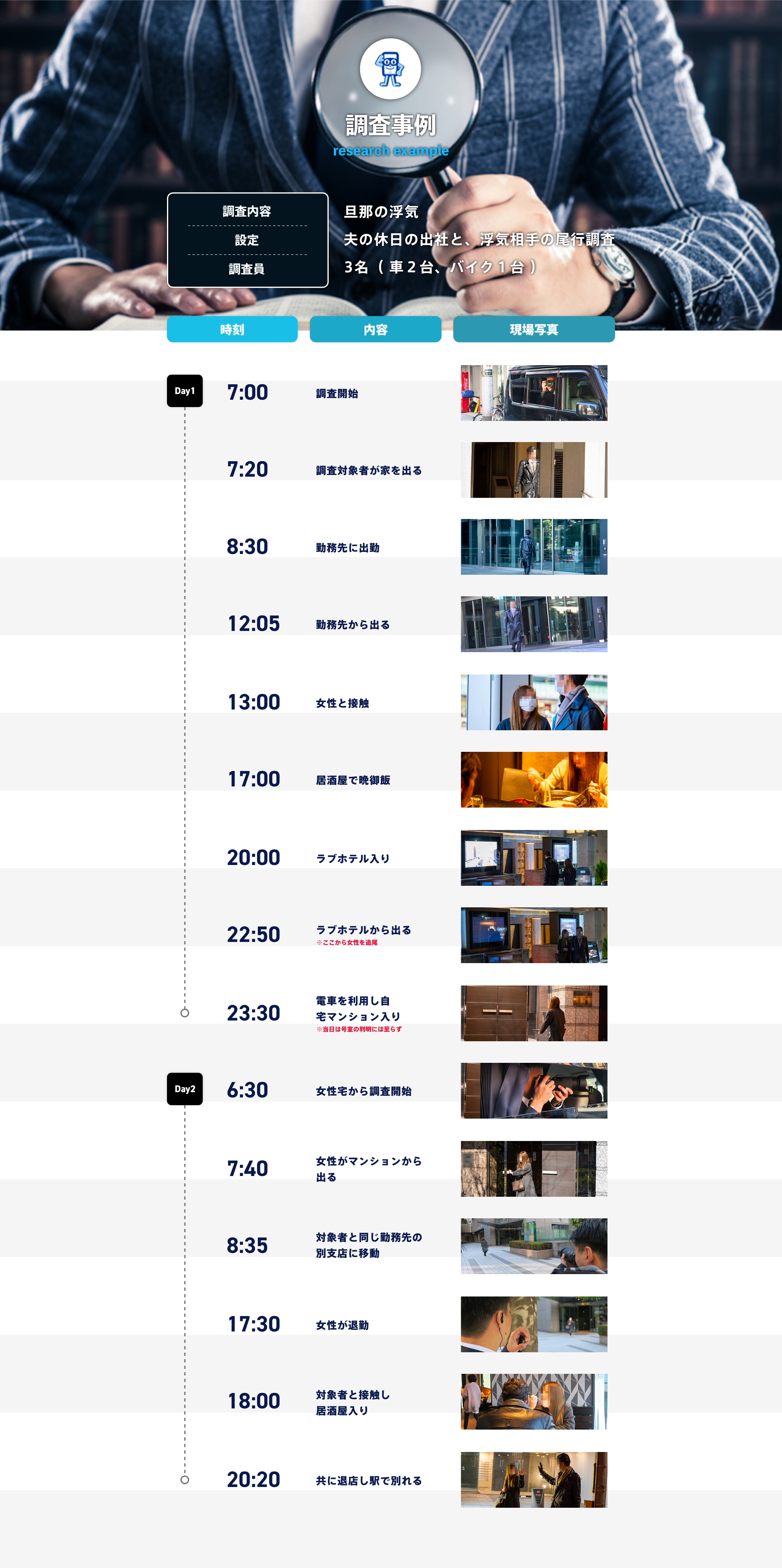 リアルタイムでの報告はあえて行っていません。対象者と一緒に暮らしている人が多いので、浮気相手とホテルに行っているという情報を教えてしまった時、帰宅した対象者と冷静にいつも通り接することが出来る人は少ないからです。但し、勝手に調査する事はなく調査時間の延長や、イレギュラーが発生した時のご指示などは、必ず連絡して相談いたします。